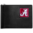 This cool new style wallet features an inner, metal bill clip that lips up for easy access. The super slim wallet holds tons of stuff with ample pockets, credit card slots & windowed ID slot. The wallet is made of genuine fine grain leather and it finished with a metal Alabama Crimson Tide emblem. The wallet is shipped in gift box packaging. Officially licensed College product Licensee: Siskiyou Buckle. Genuine fine grain leather wallet. Metal, flip out bill clip. Slim style wallet with lots of storage. Metal Alabama Crimson Tide emblem with enameled team colors