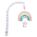 Encourage eye tracking and sound perception skills with the Rainbow Musical Mobile by Trend Lab. Features a white slide arm with a velour plush rainbow and cloud in pink, yellow, teal and purple that slowly rotates to Brahms Lullaby. Mobile easily attaches to most cribs. Mobile measures approximately 24 in tall by 20 in wide.