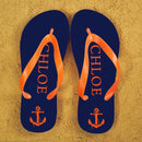 Personalised flip flops available in 3 sizes. Can be personalised with first name. Featuring orange straps and orange soles Size Guide: Large - 10 - 12 Medium - 7 - 9 Small - 4 - 6