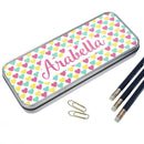 For the ultimate girly girl this pencil case is brimming with love. In a multi colored heart pattern any girl will adore having this on her desk. The tin itself is made from hardwearing stainless steel and is long & spacious enough to hold their pencils pens(a small size ruler)rubber and much more. The case can be personalised with the child's name - up to 10 characters. Dimensions: 18.8cm x 8cm x 2.4cm