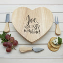 Date night? Cheese lover? Or just because? This is the gift for them! Heart shaped cheese board with integrated specialty knife compartment made from sustainable Hevea wood. Includes 3 wooden handled specialist cheese knives with stainless steel handles. Rotating knife compartment. Made from Hevea wood which is environmentally friendly. Personalise with first names and surname. The cheese board come with the following types of knives; Cheese Fork Parmesan Knife Cheddar Knife