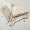 A fun baking set for children! Four different color choices for the pot - red blue pink and white The set includes a child friendly chopping board rolling pin wooden spoon pasty brush and spatula as well as a miniature recipe card with two recipes to help get them started! The set is packaged in a colored utensil pot so can be kept on the work top in the kitchen. Personalise with a name every utensil is engraved with 'Flour Power' as standard.