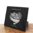 Natural slate photoframe with a heart-shaped window cut into the stone to display your photo Personalised with up to 2 messages one above and one below the frame. Dimensions: 23cm x 19cm