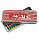 Pencil case with fun red zig zag design. The tin itself is made from hardwearing stainless steel and is long & spacious enough to hold their pencils pens(a small size ruler)rubber and much more. The case can be personalised with the child's name - up to 10 characters. Dimensions: 18.8cm x 8cm x 2.4cm