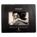 Natural slate photoframe with a window cut into the stone to display your photo Personalised with up to 2 messages one above and one below the frame. The Thank you for always being there" text and hearts fixed. Dimensions: 24cm x 19cm"