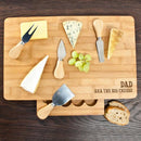 Bamboo cheese board with integrated specialty knives made from sturdy naturally antibacterial bamboo. Includes four wooden handled cheese knives with stainless steel blades. Bamboo wood is a highly environmentally friendly as it is one of the fastest growing plants in the word. Our use of bamboo is environmentally friendly and ethically produced. Personalise with name the words 'AKA THE BIG CHEESE' come as standard. The cheese board come with the following types of knives; Hard Cheese Knife Cheese Fork Stilton Knife Cheddar Knife Please fill in the personalisation fields to the right of the page.