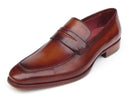 Penny Loafers style men's shoes. Tobacco & Bordeaux hand painted leather upper with leather sole and bordeaux leather lining.