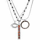Set of 3 Chicago Bears necklaces that includes; one silver plated chain with a 1 inch hoop that has alternating team colored crystals, one beaded chain with team colored beads and a bar charm featuring the team name in enameled color and finally a ball chain necklace with an expertly crafted team charm in monochromatic tones. The 16 inch necklaces that can be adjusted with the 2 inch extenders. Can be worn separately or together.