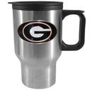 Our stainless steel sculpted travel mugs have a secure lid that easily pops off using the side thumb brace. The 14 ounce capacity mug features a metal Georgia Bulldogs emblem.