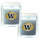 Our candle set features 2 lightly vanilla scented candles with fully cast metal Washington Huskies emblems that have an enameled team color finish. Officially licensed College product Licensee: Siskiyou Buckle. 2 glass candles. 2 x 2 inch candles. Lightly vanilla scented. Washington Huskies metal emblems