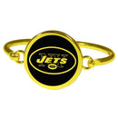 This beautiful gold toned bangle bracelet is a feminine way to show off your love of the New York Jets. The bangle features an easy to use hook and eye clasp that has a large, round centerpiece that features a monochromatic, black logo. This classy look is sure to turn heads and is understated enough for everyday wear.