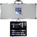 This is the ultimate New York Rangers�� tailgate accessory! The high quality, 420 grade stainless steel tools are durable and well-made enough to make even the pickiest grill master smile. This complete grill accessory kit includes; 4 skewers, spatula with bottle opener and serrated knife edge, basting brush, tongs and a fork. The 18 inch metal carrying case is perfect for great outdoor use making grilling an ease while camping, tailgating or while having a game day party on your patio. The tools are 17 inches long and feature vivid team graphics. The metal case features a large team emblem with exceptional detail. This high-end men's gift is sure to be a hit as a present on Father's Day or Christmas.