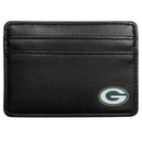 Ditch your bulky wallet! This super slim leather wallet is the perfect weekend companion. The compact design features 2 credit card slots on the front and one on the back and an inner middle pocket for cash. The front of the wallet has a crisp silk screened Green Bay Packers logo. Officially licensed NFL product Licensee: Siskiyou Buckle. Genuine fine grain leather wallet. 3 credit card slots, inner pocket for cash. Super slim wallet. Green Bay Packers silk screened logo