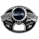 Quality detail and sturdy functionality highlight this great tailgater buckle that features an inset domed emblem Seattle Seahawks dome logo and functional bottle opener. Officially licensed NFL product Licensee: Siskiyou Buckle. Fully cast, metal buckle. Bail fits belts up to 2 inches wide. This unique buckle comes with a bottle opener. Seattle Seahawks buckle