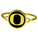 This beautiful gold toned bangle bracelet is a feminine way to show off your love of the Oregon Ducks. The bangle features an easy to use hook and eye clasp that has a large, round centerpiece that features a monochromatic, black logo. This classy look is sure to turn heads and is understated enough for everyday wear.
