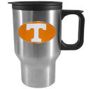 Our stainless steel sculpted travel mugs have a secure lid that easily pops off using the side thumb brace. The 14 ounce capacity mug features a metal Tennessee Volunteers emblem.
