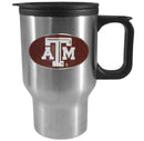 Our stainless steel sculpted travel mugs have a secure lid that easily pops off using the side thumb brace. The 14 ounce capacity mug features a metal Texas A & M Aggies emblem.