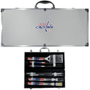 This is the ultimate Washington Capitals�� tailgate accessory! The high quality, 420 grade stainless steel tools are durable and well-made enough to make even the pickiest grill master smile. This complete grill accessory kit includes; 4 skewers, spatula with bottle opener and serrated knife edge, basting brush, tongs and a fork. The 18 inch metal carrying case is perfect for great outdoor use making grilling an ease while camping, tailgating or while having a game day party on your patio. The tools are 17 inches long and feature vivid team graphics. The metal case features a large team emblem with exceptional detail. This high-end men's gift is sure to be a hit as a present on Father's Day or Christmas.