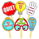 This pack of six classroom signs offer a clever way to manage your class. Each sign comes with an easy-to-use 4" wooden handle. The signs included are: Please Raise Your Hand, Time to Clean Up, Who's Got It!, Please Line Up Quietly, Quiet!, and Look and Listen. The teacher silently raises the appropriate sign to direct the student's to the correct behavior. Each sign measures approximately 8" x 12" (with handle) and is plastic-coated for durability. 6 signs each, bundle of 3, 18 signs total