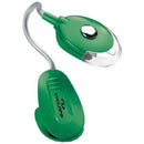 4.5 lumens; 1 LED for clear white light; Durable rubberized clamp clips nearly anywhere; Flexible arm points light in any direction; LED bulbs are 5x more energy efficient than standard bulbs; 90-min burn time; Includes 2 lithium CR-2016 batteries; Green;