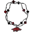 This delicate bead bracelet has eye-catching team colored beads that are strung on 2 stretch cords that provide a comfortable and easy fit. The crystals are separated by beautiful helix beads in high polish chrome for a truly designer inspired look. The 2 strands of beads intertwine for a fun and stylish bracelet. This chic accessory is finished off with a Arkansas Razorbacks team charm that has expertly carved detail and an enameled color finish. A contemporary look to thrill any female sports fan. Whether this a gift for yourself or someone special you cannot miss with this trend-setting fashion bracelet. Officially licensed College product Licensee: Siskiyou Buckle. Team colored crystals and chrome helix beads strung on a stretch cord for an easy and comfortable fit. The bracelet has 2 strands of beads joined by the charm that intertwine for a unique bangle style. . The team bracelet is finished off with a beautifully carved Arkansas Razorbacks team charm with enameled colors