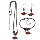 This must-have Arkansas Razorbacks look features the wildly popular euro bead style teamed with eye catching team charms. The 18 inch, snake chain necklace is paired with delicate matching earrings with hypoallergenic, steel fishhook posts and matching bracelet. Officially licensed College product Licensee: Siskiyou Buckle. Featuring the wildly popular euro beads on an 18 inch necklace with matching earrings and bracelet. High quality jewelry at a great price. On trend look paired with a sporty twist, featuring a fully cast metal team charm with enameled details. Arkansas Razorbacks ladies this jewelry set is the perfect game-day outfit accessory