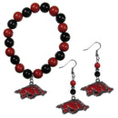 This fun and colorful Arkansas Razorbacks fan bead jewelry set is fun and casual with eye-catching beads in bright team colors. The fashionable dangle earrings feature a team colored beads that drop down to a carved and enameled charm. The stretch bracelet has larger matching beads that make a striking statement and have a matching team charm. These sassy yet sporty jewelry pieces make a perfect gift for any female fan. Spice up your game-day outfit with these fun colorful earrings and bracelet that are also cute enough for any day. Officially licensed College product Licensee: Siskiyou Buckle. Colorful dangle earrings with team colored fan beads and hypo-allergenic fishhook posts. The chic team charm has enameled team colors and carved details. Brightly colored bead bracelet stretches to fit even large wrists. This is the perfect fan set for any fashionable female Arkansas Razorbacks fan