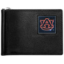 This cool new style wallet features an inner, metal bill clip that lips up for easy access. The super slim wallet holds tons of stuff with ample pockets, credit card slots & windowed ID slot. The wallet is made of genuine fine grain leather and it finished with a metal Auburn Tigers emblem. The wallet is shipped in gift box packaging. Officially licensed College product Licensee: Siskiyou Buckle. Genuine fine grain leather wallet. Metal, flip out bill clip. Slim style wallet with lots of storage. Metal Auburn Tigers emblem with enameled team colors