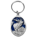 This beautiful key chain has an intricately carved elk on a blue enamel background standing in front of a mountain range. Siskiyou's unique key chains are unequaled with the best craftsmanship. Key chain is 1-1/4" x 1-3/4".Fully cast metal key chain with carved details that is built to last. Standard split ring to keep home and auto keys organized. Expertly enameled color details. .
