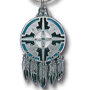 Our Native American inspired dreamcatcher key chain has a dreamcatcher with five feathers enhanced with turquoise and black enamel. Since these key rings are fully metal they stand up the rigorous day to day use and will keep looking great for years to come.Fully cast metal key chain with carved details that is built to last. Standard split ring to keep home and auto keys organized. Expertly enameled color details. .