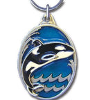 Scultped and hand enameled key ring featuring a Orca Whale emblem.Fully cast metal key chain with carved details that is built to last. Standard split ring to keep home and auto keys organized. Expertly enameled color details. .