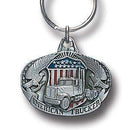 Celebrate a proud American industry with this trucker keyring. Our unique key chains are fully cast metal fobs with exceptional carved detail. Since these key rings are fully metal they stand up the rigorous day to day use and will keep looking great for years to come. The original designs are a great way to express your personal style while keeping your house and auto keys organized.Fully cast metal key chain with carved details that is built to last. Standard split ring to keep home and auto keys organized. Expertly enameled color details. .
