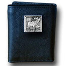 Our tri-fold wallet is made of high quality fine grain leather with an Elk emblem sculpted in in fine detail on the front panel. Includes slots for credit and business cards and clear plastic photo sleeves.Officially licensed Siskiyou Originals product Licensee: Siskiyou Buckle. Genuine fine grain leather wallet. Ample credit card slots. Windowed ID slot. Metal emblem with enameled team colors