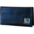 Our officially licensed checkbook cover is made of high quality leather and includes a card holder, clear ID window, and inside zipper pocket for added storage. Fully cast and enameled Miami Hurricanes team emblem on the front of the wallet.Officially licensed College product Licensee: Siskiyou Buckle. Genuine fine grain leather. Fits top and side loaded checkbooks. Credit card slots, windowed ID slot and large zippered pocket. Metal Miami Hurricanes emblem with enameled team colors