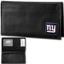 Our officially licensed checkbook cover is made of high quality leather and includes a card holder, clear ID window, and inside zipper pocket for added storage. Fully cast and enameled New York Giants team emblem on the front of the wallet.Officially licensed NFL product Licensee: Siskiyou Buckle. Genuine fine grain leather. Fits top and side loaded checkbooks. Credit card slots, windowed ID slot and large zippered pocket. Metal New York Giants emblem with enameled team colors