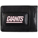 This super slim leather wallet lets you have all the benefits of a money clip while keeping the organization of a wallet. On one side of this front pocket wallet there is a strong, magnetic money clip to keep your cash easily accessible and theÊNew York Giants team logo on the front. The versatile men's accessory is a perfect addition to your fan apparel. Officially licensed NFL product. Geniune leather men's fashion accessory. Slim style wallet with lots of storage. Magnetic money clip on one side and windowed ID slot on the other. Crisp, digital New York Giants logo