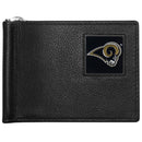 This cool new style wallet features an inner, metal bill clip that lips up for easy access. The super slim wallet holds tons of stuff with ample pockets, credit card slots & windowed ID slot. The wallet is made of genuine fine grain leather and it finished with a metal St. Louis Rams emblem. The wallet is shipped in gift box packaging. Officially licensed NFL product Licensee: Siskiyou Buckle. Genuine fine grain leather wallet. Metal, flip out bill clip. Slim style wallet with lots of storage. Metal Los Angeles Rams emblem with enameled team colors