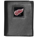 Our Detroit Red Wings leather tri-fold wallet features a sculpted and hand painted team square on a black leather tri-fold. Includes an ID window, slots for credit cards and clear plastic photo sleeves. For a sporty feel, the liner of the wallet is made with a canvas liner. Officially licensed NHL product Licensee: Siskiyou Buckle. Genuine fine grain leather wallet. Ample credit card slots. Windowed ID slot. Metal Detroit Red Wings emblem with enameled team colors