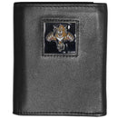 Our Florida Panthers leather tri-fold wallet features a sculpted and hand painted team square on a black leather tri-fold. Includes an ID window, slots for credit cards and clear plastic photo sleeves. For a sporty feel, the liner of the wallet is made with a canvas liner. Officially licensed NHL product Licensee: Siskiyou Buckle. Genuine fine grain leather wallet. Ample credit card slots. Windowed ID slot. Metal Florida Panthers emblem with enameled team colors