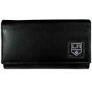 This genuine leather women's pocketbook features 9 credit card slots, a windowed ID slot, spacious front pocket, inner pocket and zippered coin pocket. The front of the pocketbook has a hand painted metal square with the Los Angeles Kings primary logo. Officially licensed NHL product Licensee: Siskiyou Buckle. Genuine fine grain leather wallet. 6 credit card slots and windowed ID slot. Large zippered pocket. Metal Los Angeles Kings emblem with enameled team colors