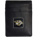 Our officially licensed Money Clip/Card Holders won't make you choose between paper or plastic because they stow both easily. Features our sculpted and enameled Nashville Predators emblem on the front of the wallet. Officially licensed NHL product Licensee: Siskiyou Buckle. Genuine fine grain leather wallet. Credit card slots. Magnetic money clip that will not damage your cards. Metal Nashville Predators emblem with enameled team colors