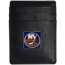 Our officially licensed Money Clip/Card Holders won't make you choose between paper or plastic because they stow both easily. Features our sculpted and enameled New York Islanders emblem on the front of the wallet. Officially licensed NHL product Licensee: Siskiyou Buckle. Genuine fine grain leather wallet. Credit card slots. Magnetic money clip that will not damage your cards. Metal New York Islanders emblem with enameled team colors