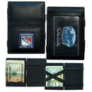 This officially licensed, innovative jacob's ladder wallet design traps cash with just a simple flip of the wallet! There are also outer pockets to store your ID and credit cards. The wallet is made of fine quality leather with a fully cast & enameled New York Rangers emblem on the front. Officially licensed NHL product Licensee: Siskiyou Buckle. Genuine fine grain leather wallet. Wallet secures your cash with just a flip. Comes with ID and card slots. Metal New York Rangers emblem with enameled team colors