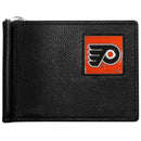 This cool new style wallet features an inner, metal bill clip that lips up for easy access. The super slim wallet holds tons of stuff with ample pockets, credit card slots & windowed ID slot. The wallet is made of genuine fine grain leather and it finished with a metal Philadelphia Flyers emblem. The wallet is shipped in gift box packaging. Officially licensed NHL product Licensee: Siskiyou Buckle. Genuine fine grain leather wallet. Metal, flip out bill clip. Slim style wallet with lots of storage. Metal Philadelphia Flyers emblem with enameled team colors
