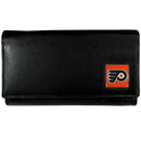 This genuine leather women's pocketbook features 9 credit card slots, a windowed ID slot, spacious front pocket, inner pocket and zippered coin pocket. The front of the pocketbook has a hand painted metal square with the Philadelphia Flyers primary logo. Officially licensed NHL product Licensee: Siskiyou Buckle. Genuine fine grain leather wallet. 6 credit card slots and windowed ID slot. Large zippered pocket. Metal Philadelphia Flyers emblem with enameled team colors