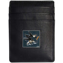 Our officially licensed Money Clip/Card Holders won't make you choose between paper or plastic because they stow both easily. Features our sculpted and enameled San Jose Sharks emblem on the front of the wallet. Officially licensed NHL product Licensee: Siskiyou Buckle. Genuine fine grain leather wallet. Credit card slots. Magnetic money clip that will not damage your cards. Metal San Jose Sharks emblem with enameled team colors