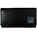 This genuine leather women's pocketbook features 9 credit card slots, a windowed ID slot, spacious front pocket, inner pocket and zippered coin pocket. The front of the pocketbook has a hand painted metal square with the San Jose Sharks primary logo. Officially licensed NHL product Licensee: Siskiyou Buckle. Genuine fine grain leather wallet. 6 credit card slots and windowed ID slot. Large zippered pocket. Metal San Jose Sharks emblem with enameled team colors