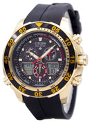 Stainless Steel Case Rubber Strap Eco-Drive ( recharged by any light source, no need to change battery) Chronograph Dual Time Insufficient Charge Warning Function Overcharge Prevention Function Power Reserve Indicator Power Saving Function Speed Display Time Setting Warning Timer World Time Crystal Glass 24hrs Display Alarm Analogue/Digital Time Display 200M Water Resistant Case Diameter 43mm Case Thickness 12mm