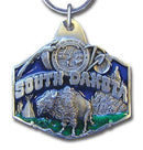 South Dakota key chain has "South Dakota" in bold surrounded by a buffalo, the Black Hills, tee pee's, a pheasant, gold miners panning tools and the seal of South Dakota. Key chain is enhanced with blue and green enamel. On the back are the words "South Dakota became the 40th state on November 2, 1989. The state flower is the Pasqueflower and the state bird is the Ring-necked Pheasant." Key chain is 1-3/4" x 1-1/2".Fully cast metal key chain with carved details that is built to last. Standard split ring to keep home and auto keys organized. Expertly enameled color details.