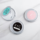An elegant compact makeup mirror guest gift, These Personalized Silver Compact Mirror gets the Monogram treatment! The personalized Monogram sticker placed on the top of the silver plastic exterior of the compact mirror favors celebrates weddings, birthdays, anniversaries and more, while guests receive a favor they can use at home or on the go. The compact mirror for purse is small and compact, and is sized to slip right into a pocket or clutch if needed. Features and Facts: Silver finish plastic compact with single mirror on the inside. Measures approximately 2.5" w x 2.5" h x 0.2" d.Can be personalized with a Monogram sticker design.Minimum order of 24 required for personalization.Some assembly required.Due to personalization, please allow 3-5 business days for processing.